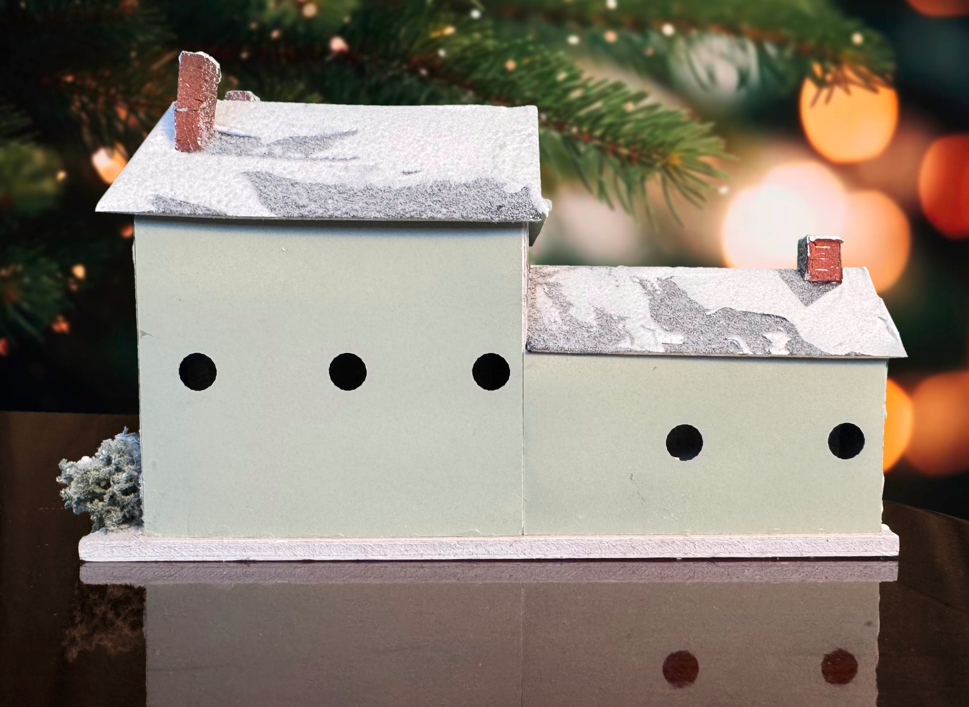 The house can be lighted using LED fairy lights or small standard miniature lights inserted in either the back or bottom of each piece. May also use battery operated Tea Lights.