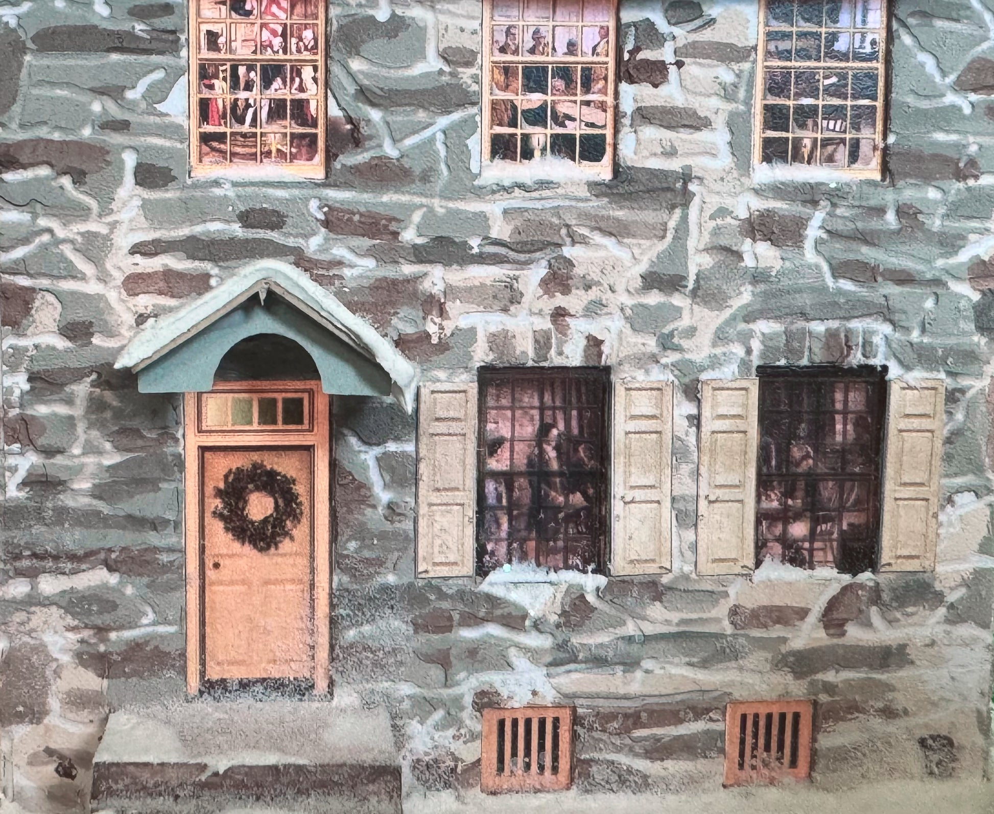 From the "Historical Collection" the Isaac Potts House is located in Valley Forge Pennsylvania, the location of George Washington's 1777 headquarters during the American Revolutionary War. This piece features stucco exterior with stone design, and includes the General's encampment flag. The window images depict the General's war planning, and of actual images from the interior of the building.