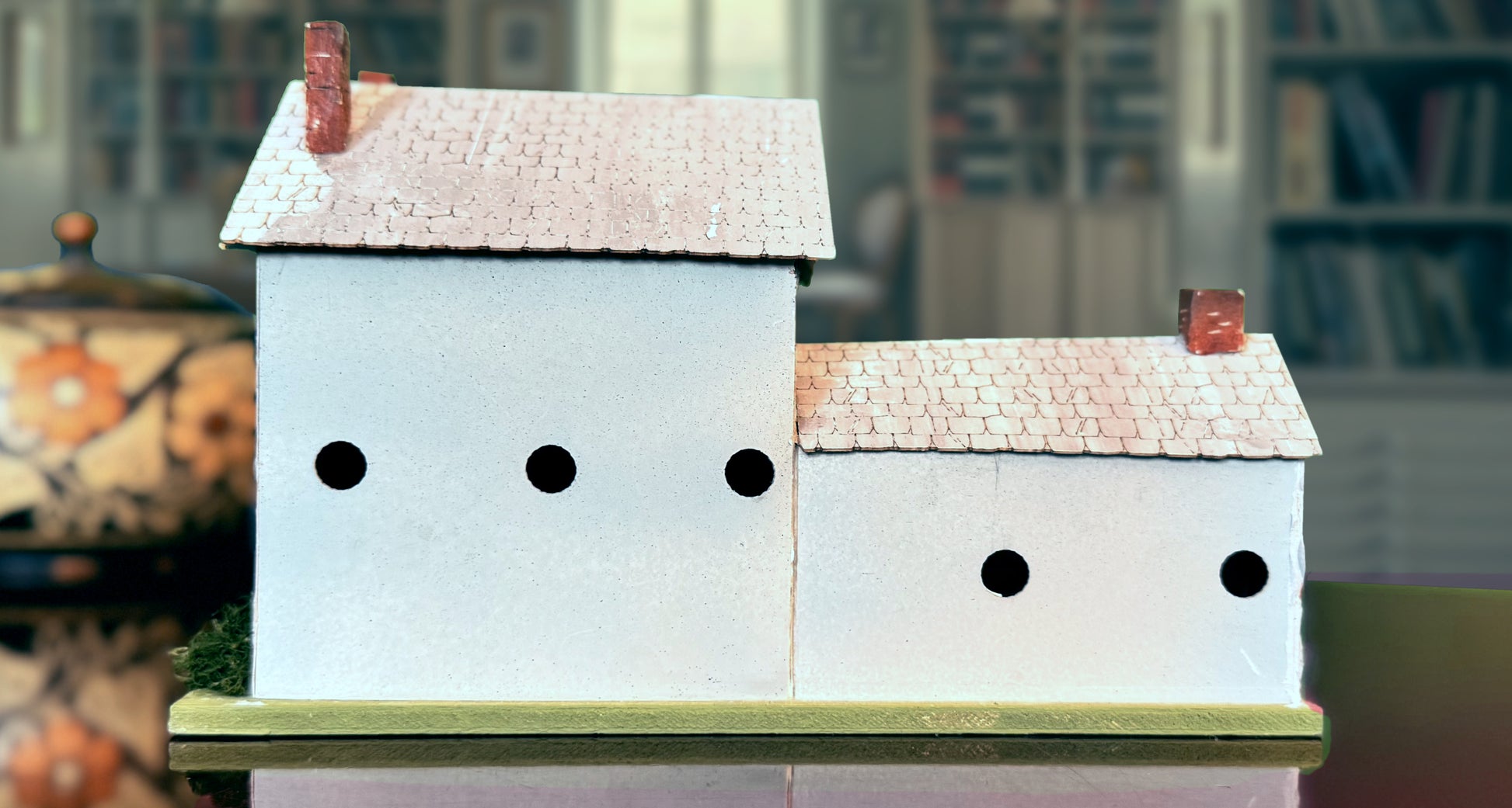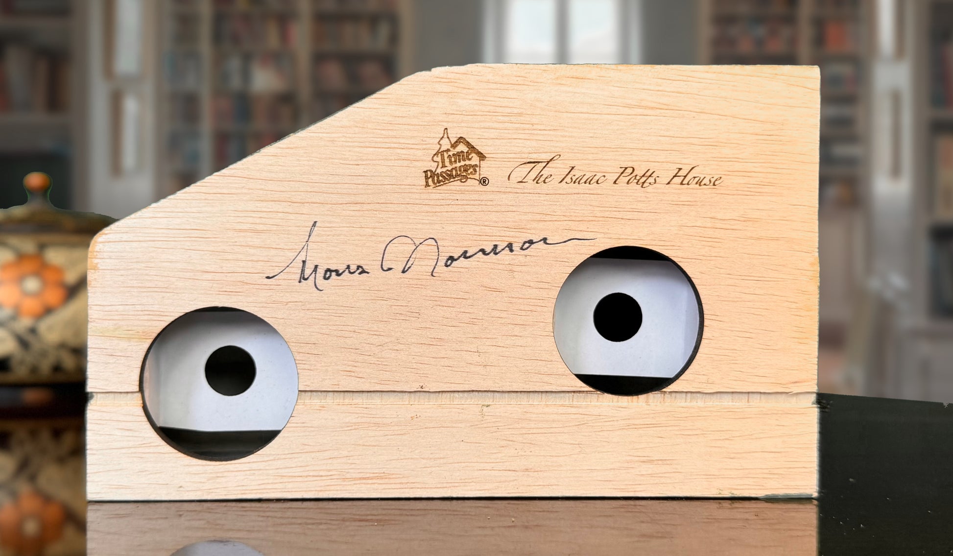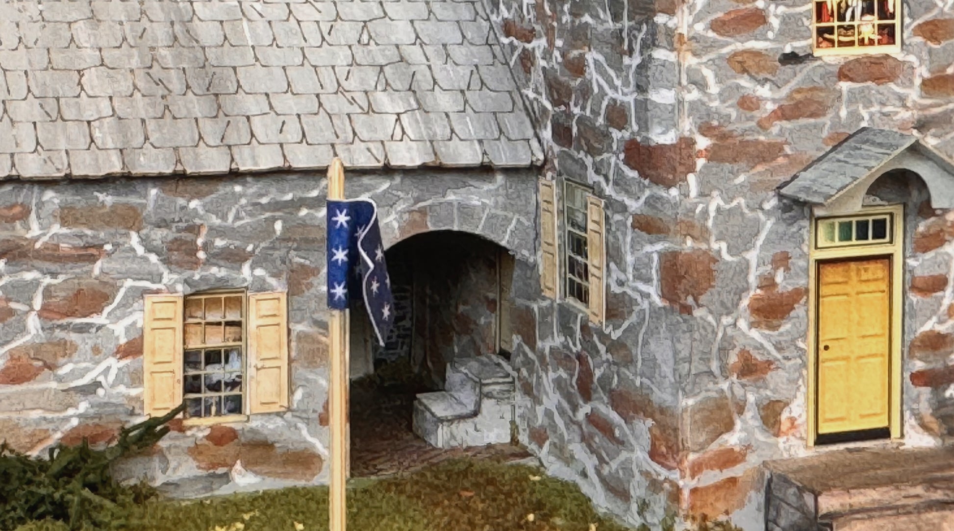 Great for the Fourth of July! This house is a handmade replica of the historical Isaac Potts House located in Valley Forge Pennsylvania and location of George Washington’s 1777 headquarters during the Revolutionary War. It is made of sturdy cardboard, with wooden base including the Generals’ encampment flag, and has detailed window scenes depicting Washington planning the war. The two lower front windows have a 3D effect scene depicting this event. It comes signed, and shipped with historical and informational cards in labeled gift box with tissue paper.